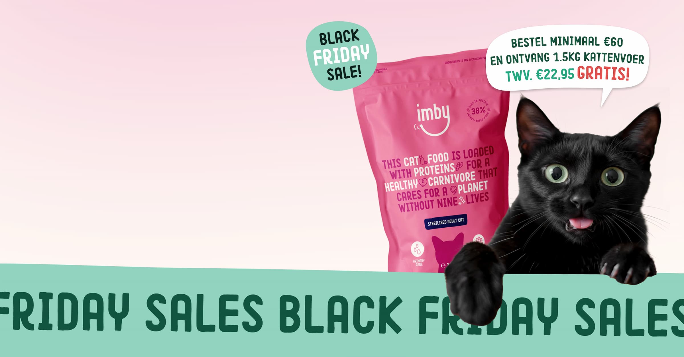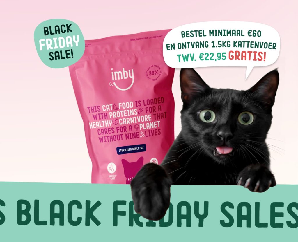 De meest purr-fecte IMBY Black Friday-deal ooit is daar — bestel €60 of meer en ontvang 1.5kg kattenvoer twv. €22,95 GRATIS — Plus maak kans op een jaar gratis dierenvoeding!